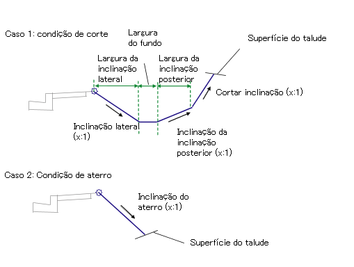 O ponto de anexação é no bordo interno da inclinação lateral da valeta para corte, e no bordo interno do vínculo de talude para aterro.