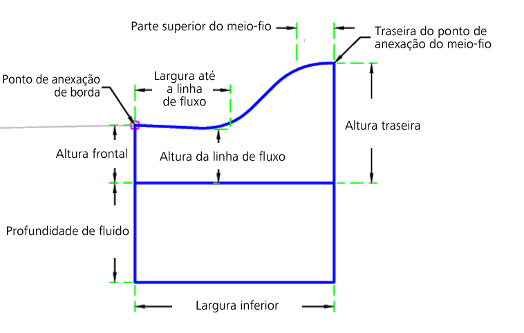 Os vínculos do meio-fio e da sarjeta são inseridos com base nas cotas dos parâmetros de entrada. Todas as cotas precisam ter valores positivos diferentes de zero.