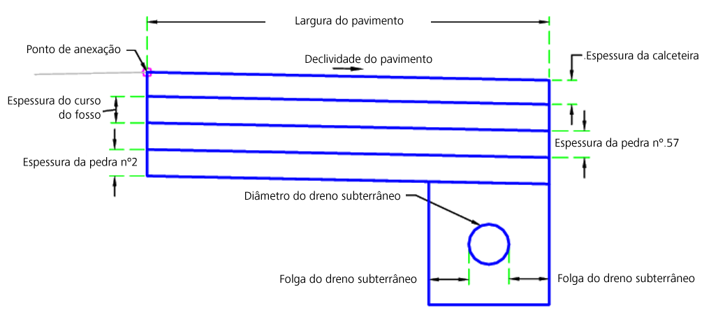 | Largura do pavimento permeável | Pode ser utilizada para substituir a largura do pavimento. Os seguintes tipos de objeto podem ser usados como alvos para especificar a largura: alinhamentos, polilinhas, linhas do recurso ou imagens do levantamento topográfico. | Opcional |