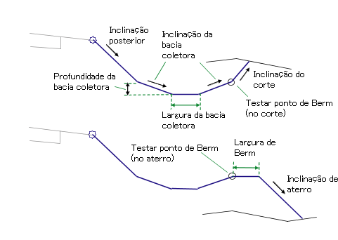Essa submontagem insere vínculos para criar uma bacia coletora e um inclinação de talude cortado para uma condição de corte ou uma bacia coletora, berma e inclinação de aterro para uma condição de aterro.