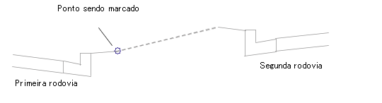 No exemplo abaixo, há duas rodovias com perfis independentes. Uma vez que os vínculos para a primeira rodovia sejam criados, o ponto no bordo esquerdo externo estará sendo marcado. Posteriormente, após os vínculos para a segunda rodovia serem criados, um vínculo poderá ser inserido de seu bordo direito externo de volta para o ponto marcado.