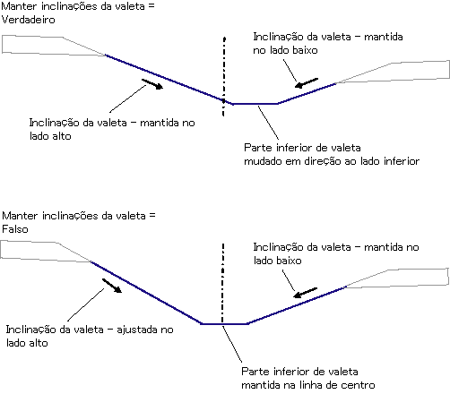 A parte superior das inclinações da valeta podem estar em diferentes elevações à esquerda e à direita, resultando em uma valeta assimétrica. Há duas opções para resolver esta situação. Se Manter elevações da valeta estiver definido como Verdadeiro, então os valores da Inclinação 1 e da Inclinação 2 são mantidos em ambos os lados, que movem o fundo da valeta para fora da linha de centro direção ao lado inferior. Se definido como Falso, o fundo da valeta será centralizado sobre o deslocamento do ponto do meio entre as partes superiores das inclinações, a inclinação fornecida será mantida no lado inferior, e a elevação será ajustada para coincidir com o lado superior.