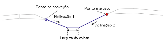 As localizações do ponto de anexação e do ponto marcado são determinadas. O ponto marcado pode estar tanto à direita quanto à esquerda do ponto de anexação. Os vínculos são estendidas para dentro na Inclinação 1 do ponto de anexação e na Inclinação 2 do ponto marcado, até que efetuem a intersecção. Se uma largura de valeta for fornecida, um vínculo do fundo da valeta é ajustado nas inclinações dos lados com intersecção.
