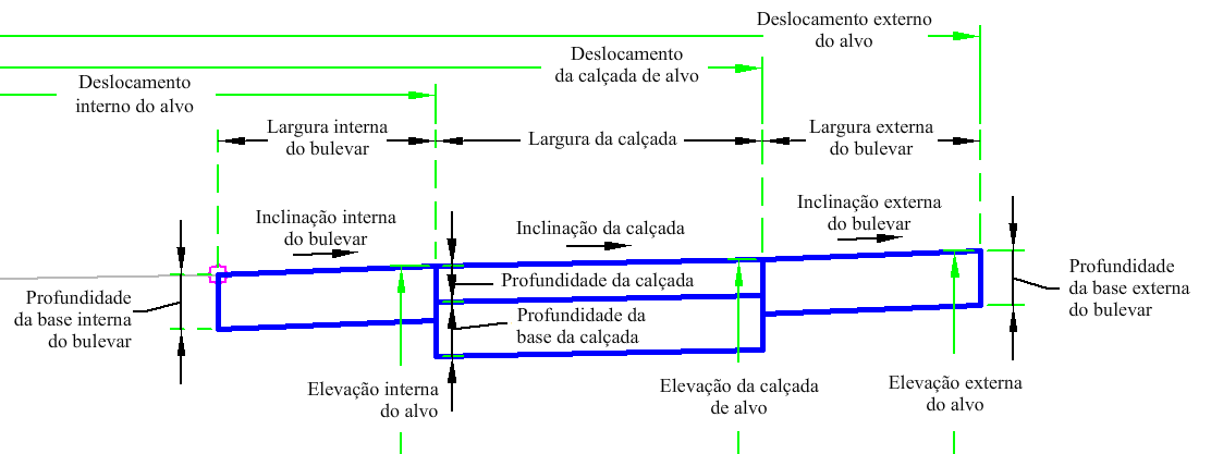| Elevação do bulevar interno | Pode ser utilizada para substituir a inclinação do bulevar interno e vincular a margem externa do bulevar interno com a elevação de um perfil. Os seguintes tipos de objeto podem ser usados como alvos para especificar a elevação: perfis, polilinhas 3D, linhas do recurso ou imagens de levantamento topográfico. | Opcional |