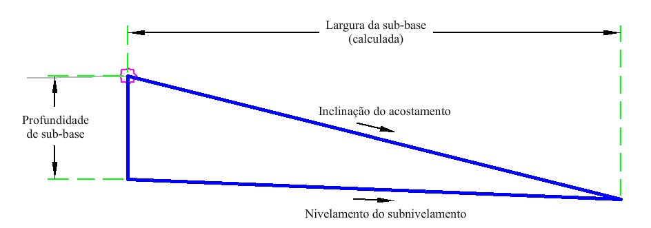 O acostamento é inserido para a determinada profundidade do acostamento, inclinação do acostamento e subnivelamento do acostamento. A largura é calculada onde a inclinação do acostamento e o subnivelamento do acostamento efetuam a intersecção. Então os pontos, vínculos e formas são calculados.