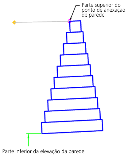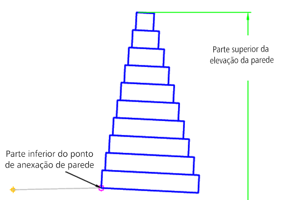 | Parte superior da elevação da parede | Pode ser usado para definir a parte superior da elevação da parede quando o ponto de anexação é definido como a parte inferior da parede. Os seguintes tipos de objeto podem ser usados como alvos para especificar a elevação: perfis, polilinhas 3D, linhas do recurso ou imagens de levantamento topográfico. | Exigido quando o ponto de anexação é a Parte inferior da parede |