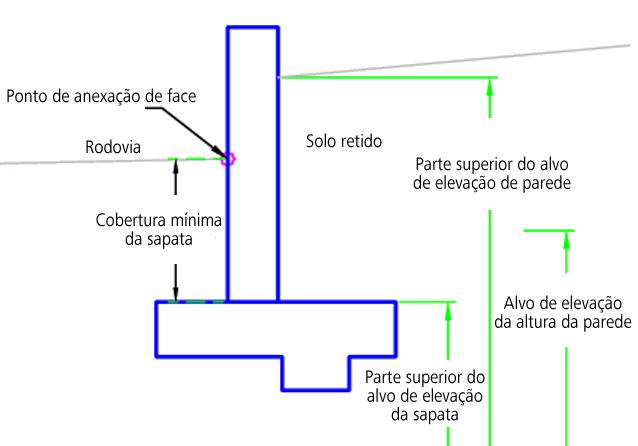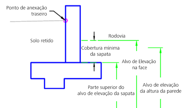 | Parte superior da sapata | Pode ser usada para controlar a parte superior da elevação da sapata. Os seguintes tipos de objeto podem ser usados como alvos para especificar a elevação: perfis, polilinhas 3D, linhas do recurso ou imagens de levantamento topográfico. | Necessário |