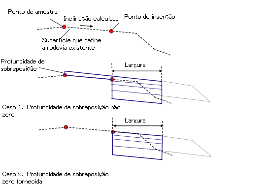 As elevações do ponto de amostra e do ponto de inserção na superfície existente são determinados, e a inclinação é calculada entre esses dois pontos. Uma camada de sobreposição é adicionada acima da pista existente na mesma inclinação da profundidade da sobreposição. Uma forma de sobreposição fechada é criada ao substituir um ou mais vínculos acima da declividade existente. A pista de expansão é anexada fora da sobreposição no deslocamento de inserção usando a inclinação calculada.