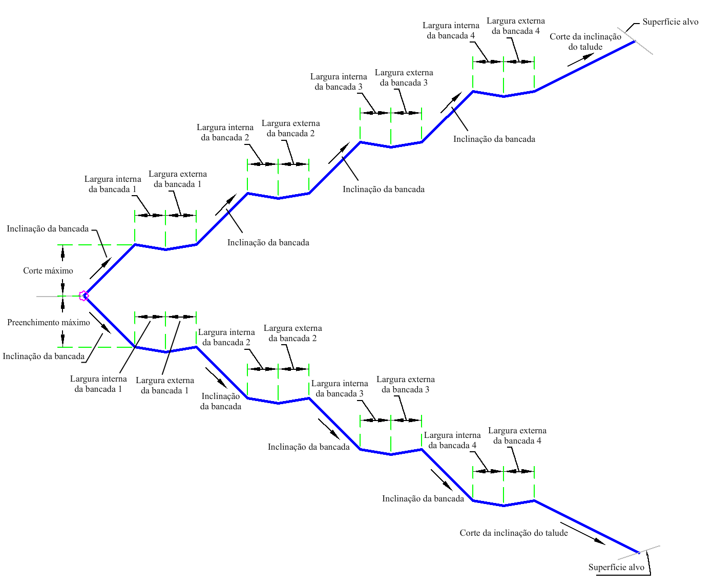 Em cada bancada os valores de entrada inseridos são utilizados para determinar os taludes e as profundidades. Após quatro bancadas, O Corte da inclinação do talude ou Aterro da inclinação do talude é usado para o talude e nenhuma outra bancada é adicionada.