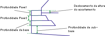 Os vínculos de superfície Pave1, Pave2 e Base são inseridos em paralelo à declividade final nas profundidades especificadas. Se a camada valores de extensão for diferente de zero, cada camada é estendida para uma determinada distância para além do ponto de articulação do ressalto. Cada camada deve ser tão larga ou mais larga do que a que está acima.