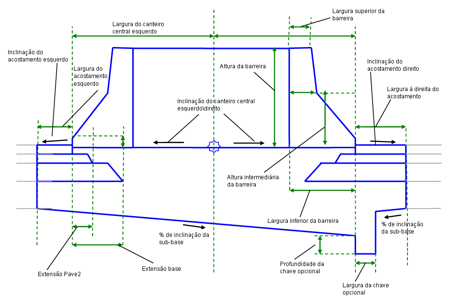 | Extensão de base esquerda | Largura a qual a Camada Base se estende além da margem do acostamento pavimentado no lado esquerdo do canteiro central. Isto é fornecido, mesmo se a largura do acostamento esquerdo estiver definida como zero. | Numérico, positivo |