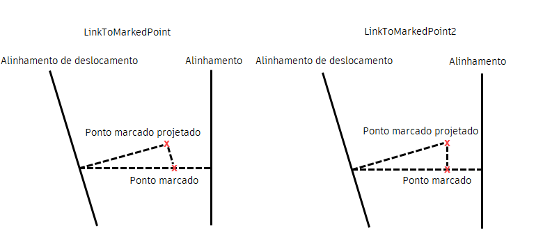 A principal diferença entre a submontagem LinkToMarkedPoint2 e a submontagem LinkToMarkedPoint está na aplicação, quando o ponto marcado está em uma linha base da montagem de deslocamento, e não no vínculo. A ilustração a seguir mostra a diferença entre as duas submontagens.