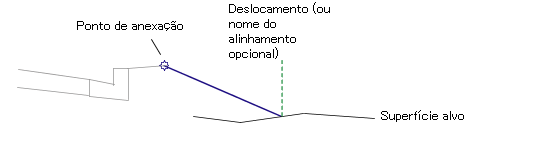 Pode ser utilizado para substituir o deslocamento fixo e vincular o final do vínculo a um alinhamento de deslocamento. Os seguintes tipos de objetos podem ser usados como alvos para especificar este deslocamento: alinhamentos, polilinhas, linhas de recurso ou imagens de levantamento topográfico. |