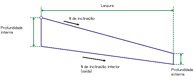 A declividade do acabamento da forma é inserida para uma determinada Largura e % Inclinação para fora do ponto de fixação. A inclinação do vínculo inferior é calculado com base na profundidade interna e externa da forma. Os códigos de ponto, vínculo e forma são definidos nos parâmetros de entrada por meio das sequências de caracteres definidas pelo usuário.