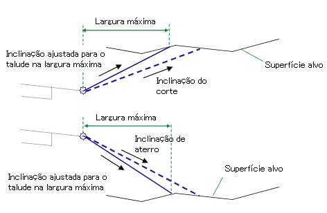 Se necessário, a inclinação é ajustada para manter o ponto de talude dentro de uma largura máxima a partir do ponto de articulação.