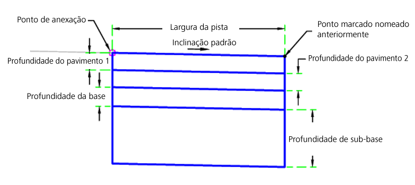 | Ponto de inserção | Especifica o ponto de inserção da pista no coroamento ou na aresta da pista de rolagem. | Coroa/ EdgeOfTravelWay | Crown |
