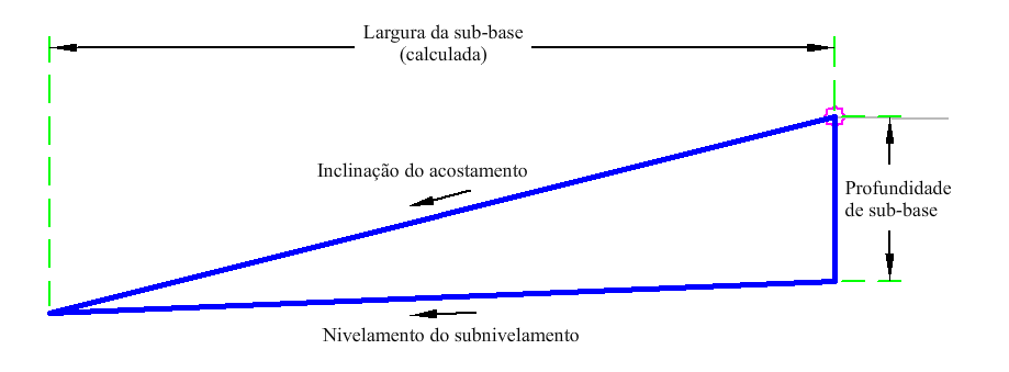 O acostamento é inserido para a determinada profundidade do acostamento, inclinação do acostamento e subnivelamento do acostamento. A largura é calculada onde a inclinação do acostamento e o subnivelamento do acostamento efetuam a intersecção. Então os pontos, vínculos e formas são calculados.
