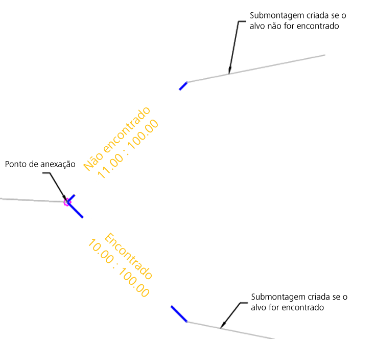 | Condição | Especifica a condição disponível para esta submontagem. A condição Encontrada será processada se o alvo de deslocamento estiver localizado dentro da distância máxima. A condição Não Encontrada será processada se o alvo de deslocamento não estiver ajustado ou não estiver encontrado na estaca dentro da distância máxima. | Encontrada/Não Encontrada | Encontrada |
