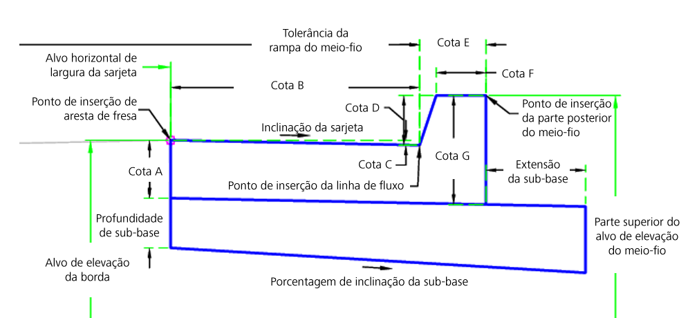 | Ponto de inserção | Especifica o ponto de inserção de meio fio e sarjeta como aresta da sarjeta ou traseira de meio-fio | GutterEdge/CurbBack/Flowline | Linha de fluxo |