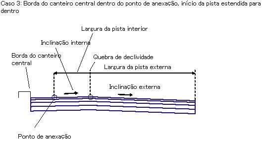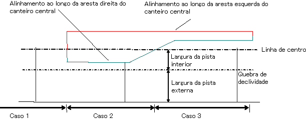 O alinhamento que define o bordo do canteiro central pode, às vezes, não estar presente (caso 1), estar fora da linha de centro da rodovia (caso 2) ou estar dentro da linha de centro (caso 3 ).