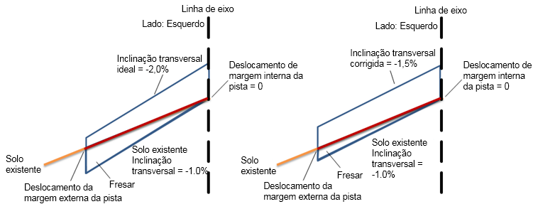 A Superelevação externa ou interna substituirá a Inclinação transversal ideal. Os valores de inclinação transversal corrigida da camada de sobreposição serão definidos de acordo com a tabela de superelevação da seção, e não de acordo com inclinação transversal ideal.