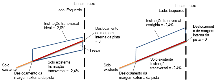 O valor definido para a inclinação transversal corrigida é sempre igual ao valor definido para a inclinação do solo existente.