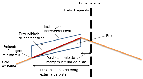 A inclinação transversal e os ajustes de elevação corresponderão ao Nível mínimo e/ou à Profundidade mínima da fresagem. A base é a superfície existente.