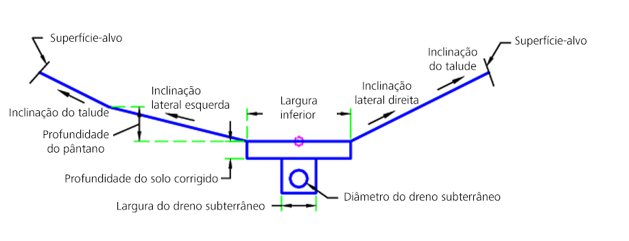 A partir do ponto de anexação, o pântano é criado usando os parâmetros de entrada. Se a superfície-alvo for definida, a superfície do talude será encontrada (somente para situações de corte). Se Incluir dreno subterrâneo for definido como Sim, então será criado o dreno subterrâneo.