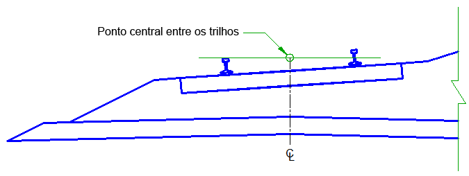 Se o Método de giro for definido como Linha base do centro, ambos os trilhos serão ajustados em uma quantidade igual à metade do valor da superelevação ferroviária, com o trilho externo para cima e o trilho interno para baixo.