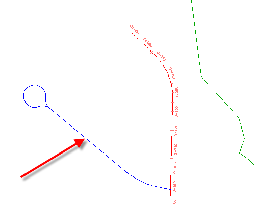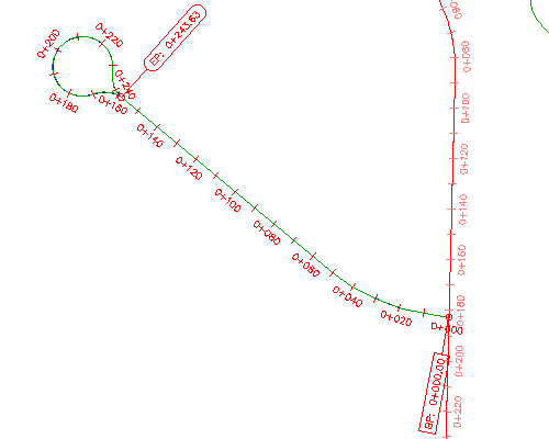 Na imagem anterior, as legendas EP: 0+243.63 e PC: 0+158.39 são exibidas em lados opostos ao alinhamento para maior clareza. Você irá aprender a inverter as legendas para o lado oposto de um alinhamento em um exercício posterior.