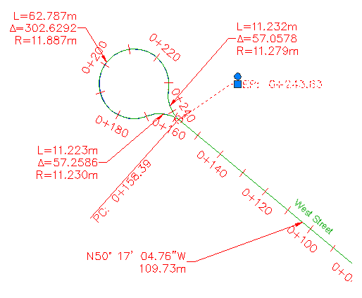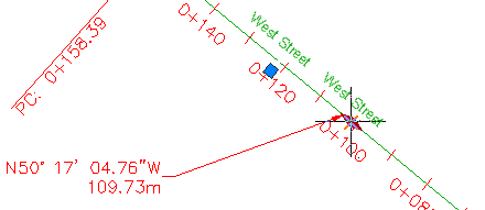 Observe que tanto o alinhamento da Main Street quanto o da East Street e suas legendas de estaca estão selecionados. As legendas foram selecionadas porque elas foram criadas no desenho referenciado externamente no qual os alinhamentos residem. Quando um objeto foi criado por meio de uma Refex, você somente pode editar suas legendas no desenho de origem.