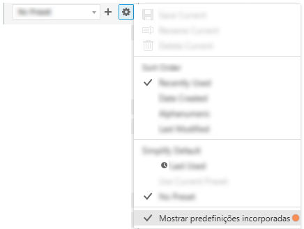 (*) Asteriscos em predefinições (por exemplo *Predefinição 1) indicam que um dos valores de definição de operação da versão salva foi alterado. Para salvar a predefinição modificada, use o menu suspenso de configurações e substitua a predefinição anterior. Como alternativa, você pode usar
