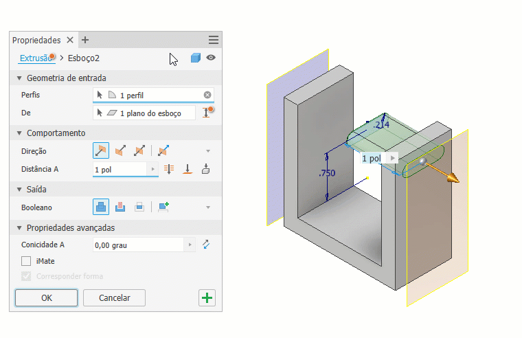 - Para comandos com parâmetros de conicidade, como Extrusão, quando são usadas as opções Para/Para seguinte/Passante, o controle Conicidade na tela é ativado quando você clica no campo de edição de valor de Conicidade no painel Propriedades.