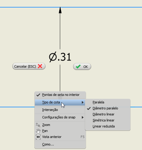 Quando você seleciona a aresta de silhueta de uma operação cilíndrica (eixo ou furo), é criado um novo tipo de cota, Diâmetro paralelo com um símbolo Ø.