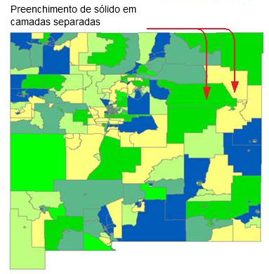 Você pode preencher as polilinhas fechadas em seu desenho com preenchimentos de sólido e padrões de hachura. Por exemplo, você pode usar uma cor para mostrar os municípios com uma população acima de 10.000 e outra cor para mostrar países com menos de 10.000 pessoas.