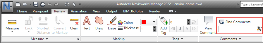 - Na caixa de texto Quick Find Comments, digite a sequência de texto a ser pesquisa em todos os comentários. Esta pode ser uma palavra ou algumas palavras. Portanto, por exemplo, ao digitar a palavra redline e executar a pesquisa, aparecem como resutados somente os comentários que contenham a palavra “redline”.