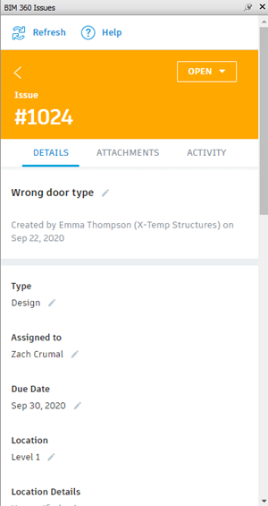 - No painel BIM 360 Issues, abra um problema conforme descrito acima.