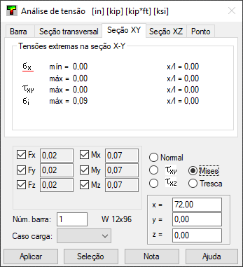 Após selecionar a guia Seção XY na caixa de diálogo Análise de tensão, são apresentadas as tensões extremas obtidas na seção de barra XY selecionada.