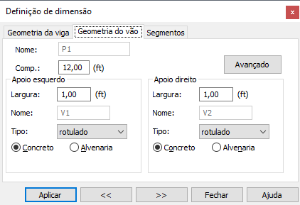 Ao pressionar o botão Avançado, será aberta a caixa de diálogo Opções avançadas de apoio, onde é possível definir os deslocamentos de apoios (a opção está ativa para vigas ou sapatas contínuas que são componentes de uma estrutura). Isso permite deslocar um apoio pela metade da largura, no máximo.