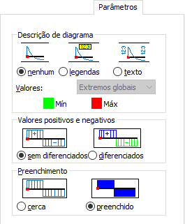 - Os campos Valores positivos e negativos permitem determinar se os valores positivos e negativos da quantidade exibida devem ser diferenciados por cores nos diagramas.