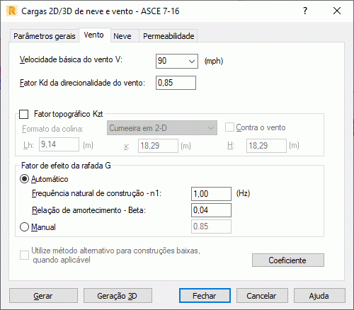 A opção Usar método alternativo para construções baixas, quando aplicável está na parte inferior da caixa de diálogo. O método alternativo se aplica a construções com alturas de até 60 pés. Para esse método alternativo, os fatores de vento são calculados com base no diagrama na figura 6-4. Para o método padrão, os fatores de vento são calculados com base no diagrama na figura 6-3.