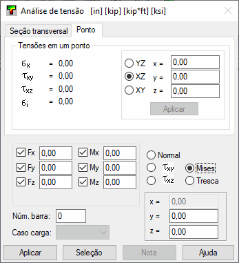 Na guia Ponto da caixa de diálogo Análise de tensão, são exibidas as tensões extremas obtidas no ponto selecionado da barra.