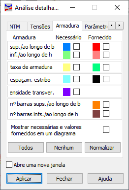 Selecione Análise detalhada para selecionar as quantidades para as barras selecionadas de uma estrutura, bem como para determinar os parâmetros de apresentação dos resultados.
