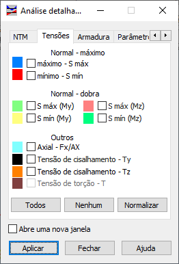 Nas opções NTM, Tensões e Armadura, é possível selecionar as quantidades para as barras selecionadas de uma estrutura. Os valores das quantidades selecionadas (deslocamentos, forças internas, tensões, valores teóricos (obrigatório) ou reais (fornecido) da área de armadura ou da taxa de armadura) serão apresentados graficamente. Eles são visíveis no visualizador e na tabela. É possível indicar várias quantidades a serem apresentadas simultaneamente para as barras selecionadas de uma estrutura.