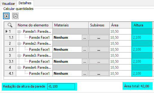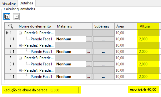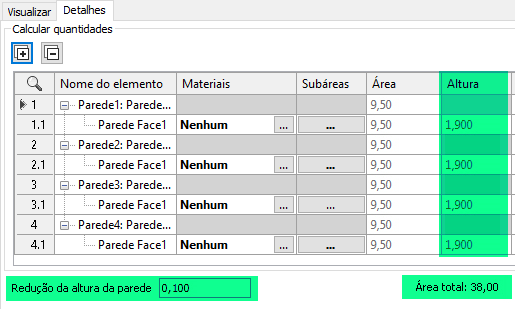Nota: Essa ferramenta só está disponível para superfícies de parede. A Redução da altura da parede está desativada para as outras quantidades de ambientes.