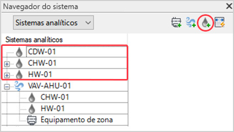 Use as ferramentas no Navegador do sistema para adicionar equipamento de zona, sistemas de ar e ciclos de água.