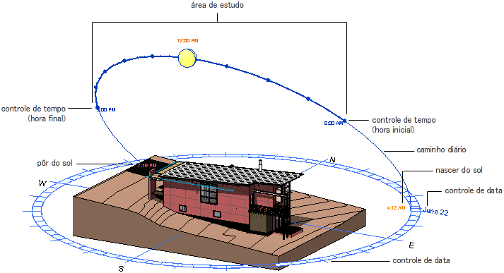 O caminho do sol é exibido dentro do contexto do projeto e permite posicionar o sol em qualquer ponto desta faixa de movimento, entre o nascer e o pôr do sol, durante o ano. Com o uso dos controles na tela do caminho do sol, é possível criar estudos solares ao colocar o sol em qualquer ponto ao longo do seu caminho diário e em qualquer ponto ao longo do analema (como descrito nas ilustrações e na tabela a seguir).