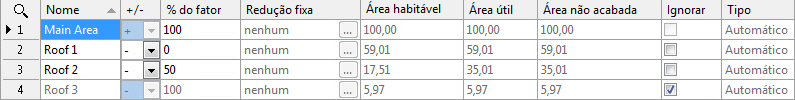 - Telhado 3: indica os dados da subárea da área acima da linha de altura de 2,00 m. A área é adicionada à área de ambiente. Essa área foi definida como Ignorar por padrão e é somente leitura nesta caixa de diálogo. Por isso, o valor da subárea é subtraído da área principal, e o resultado é calculado corretamente no identificador de ambiente. Quando você resume a área líquida do ambiente da subárea, é possível ver que o resultado da NRA corresponde à área principal.