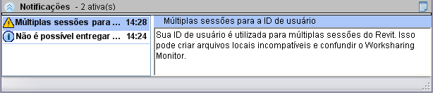 No Worksharing Monitor, uma notificação ativa informa sobre um problema atual que afeta (ou pode afetar) seu trabalho no Revit.