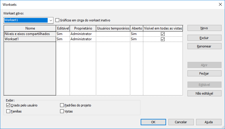 A imagem a seguir mostra a caixa de diálogo Worksets, como os dois worksets padrão do usuário criados, Níveis de compartilhamento e Grades e Workset1.